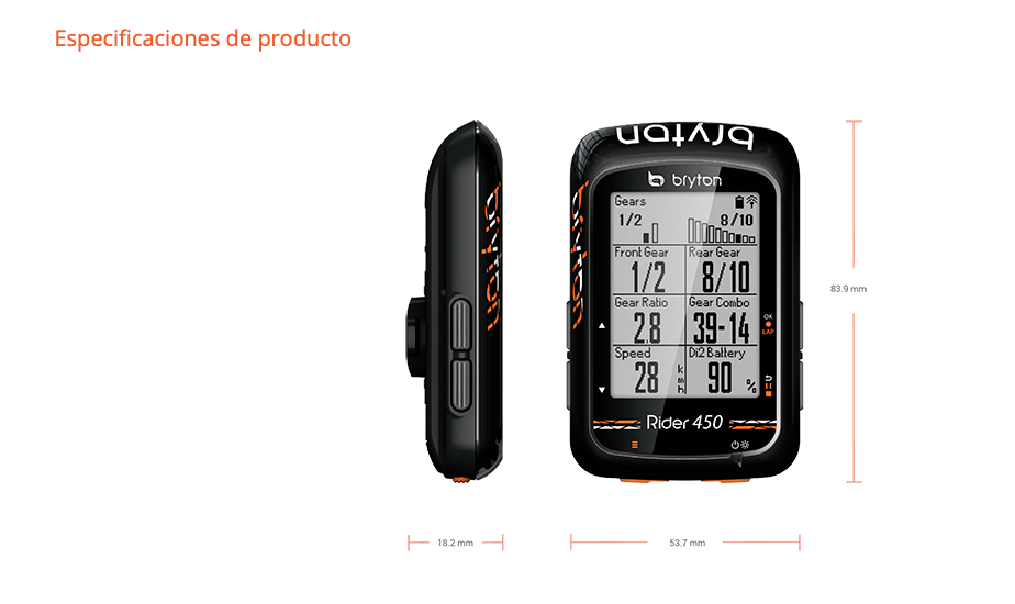 Su Rider 450 proporciona todos los datos para que pueda conocer el rendimiento de su recorrido al completo. Incorpora más de 78 funciones, que incluyen Tiempo, Velocidad, Distancia, Calorías, Cadencia, Altitud, Potencia, Frecuencia cardíaca y Shimano Di2.